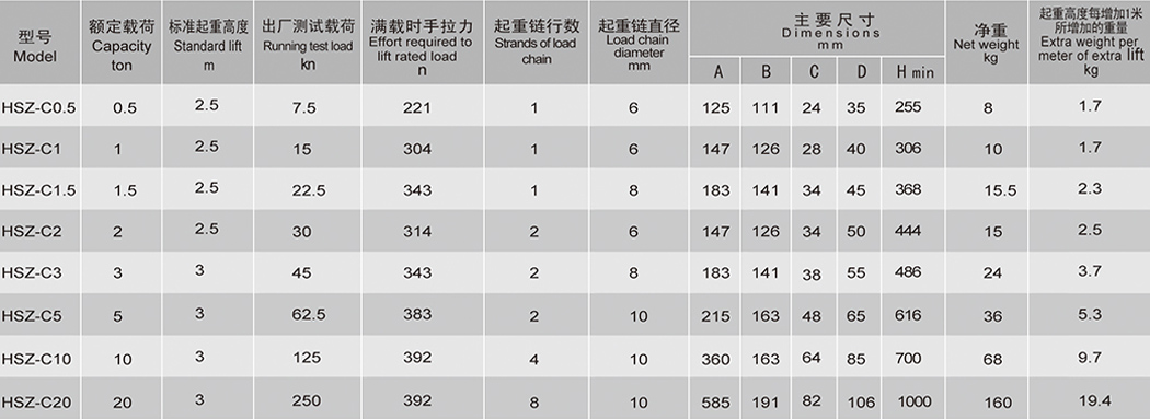 五牛牌HSZ-C型3T手拉葫蘆技術(shù)參數(shù):